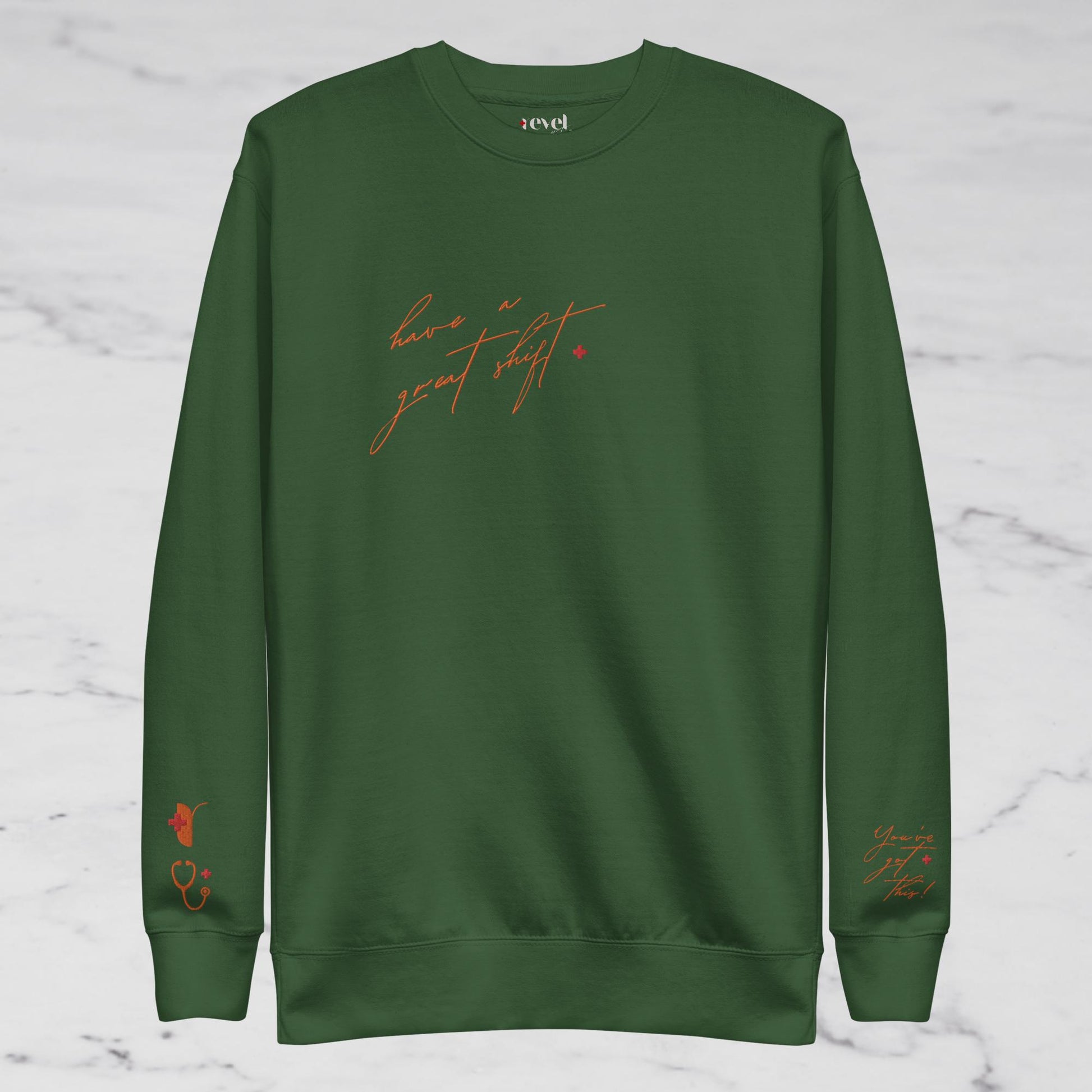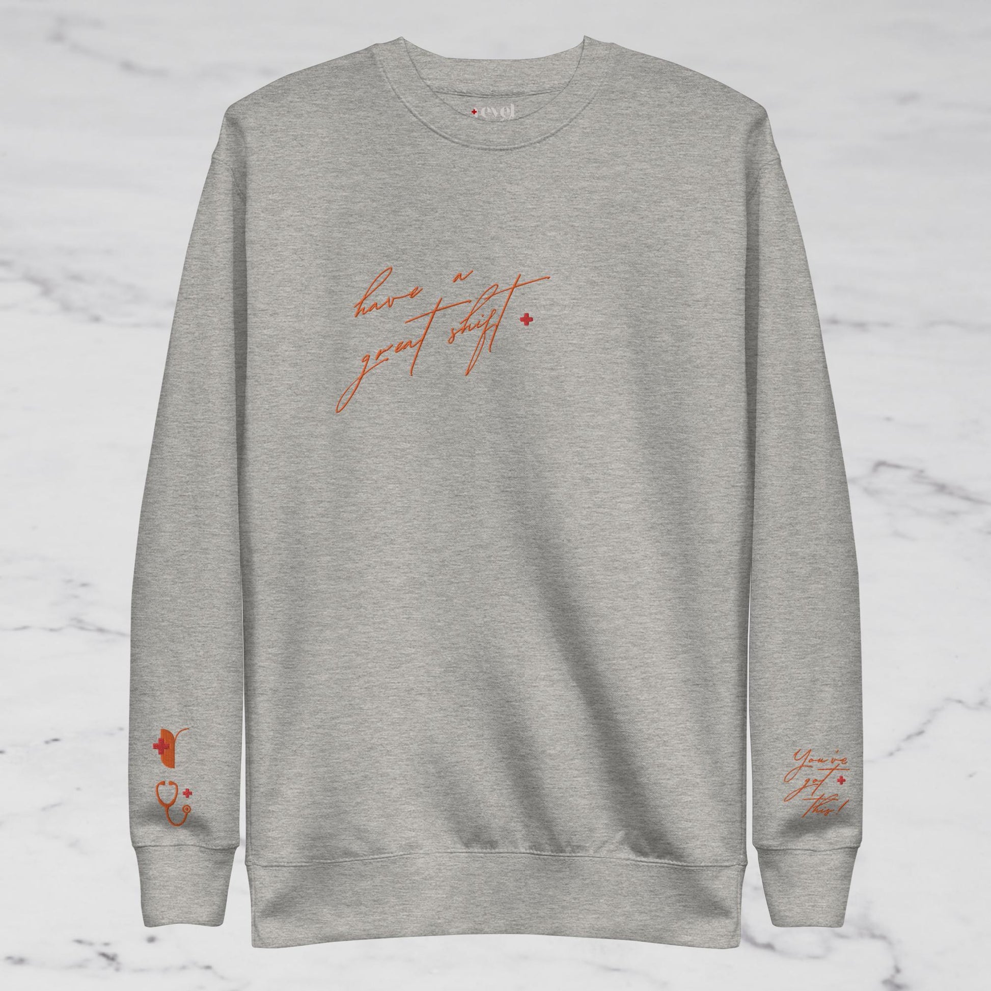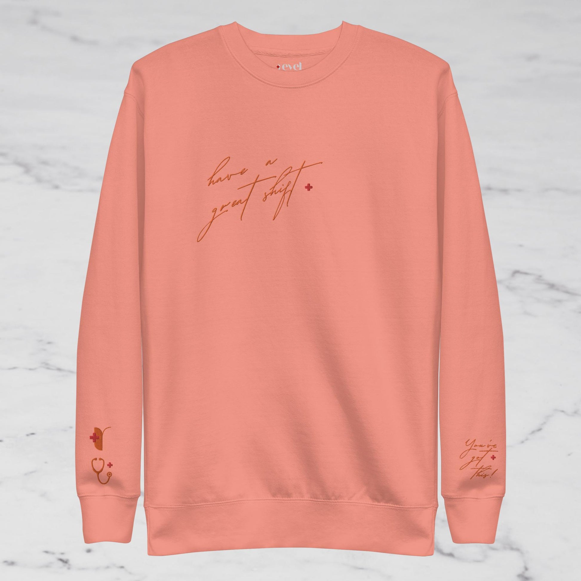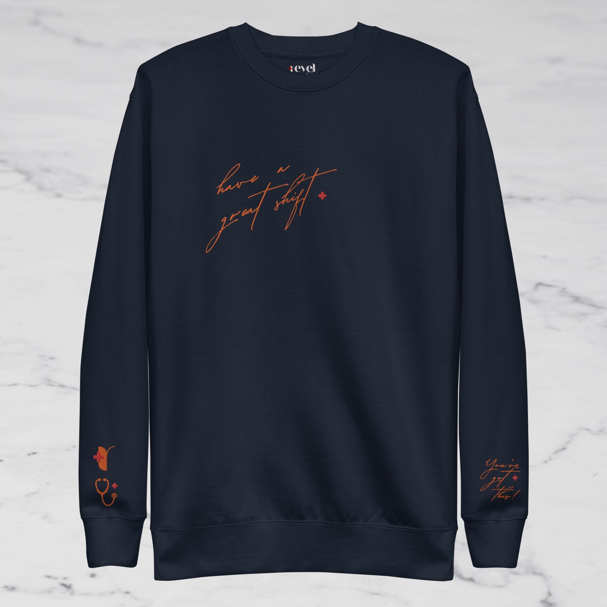 Cold, sleep-deprived and just rolled out of bed 15min late but want to look put together for your shift? Our bright orange embroidered crewneck is for you! With the soft fleece inside and comfortable fit, it’s sure to become a staple during your set!